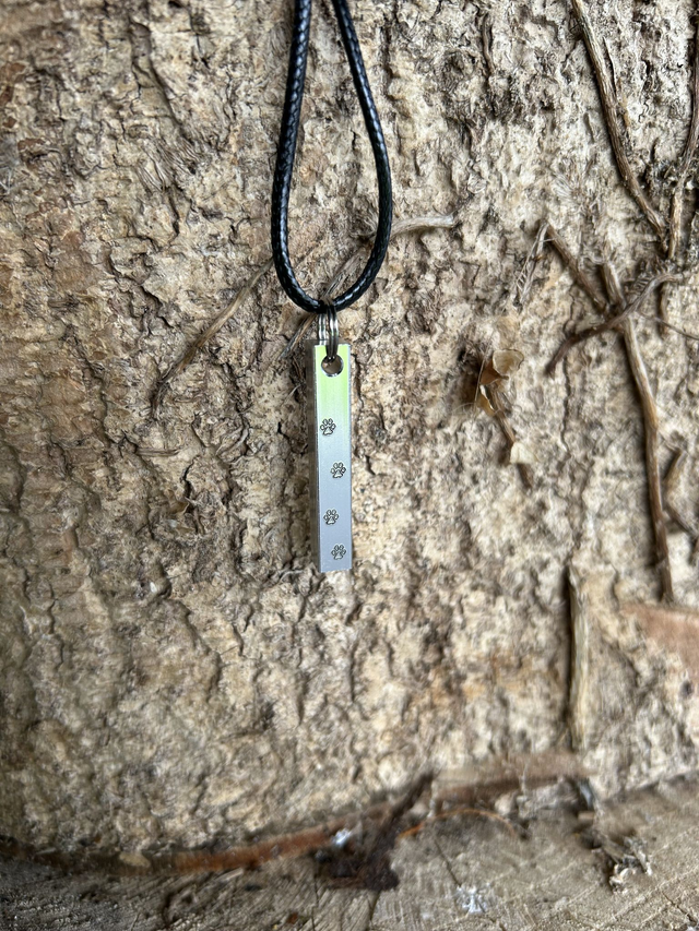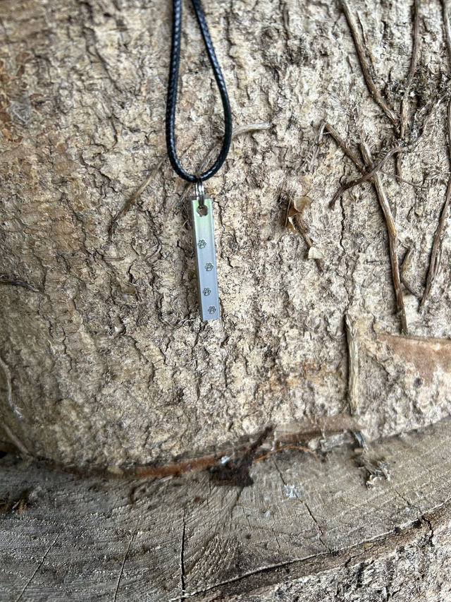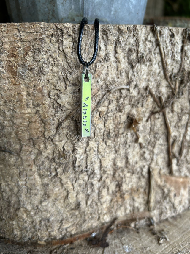 - handstamped with pets name ,angel wings & pawprints. Aluminium Bar with waxed cord hardware.