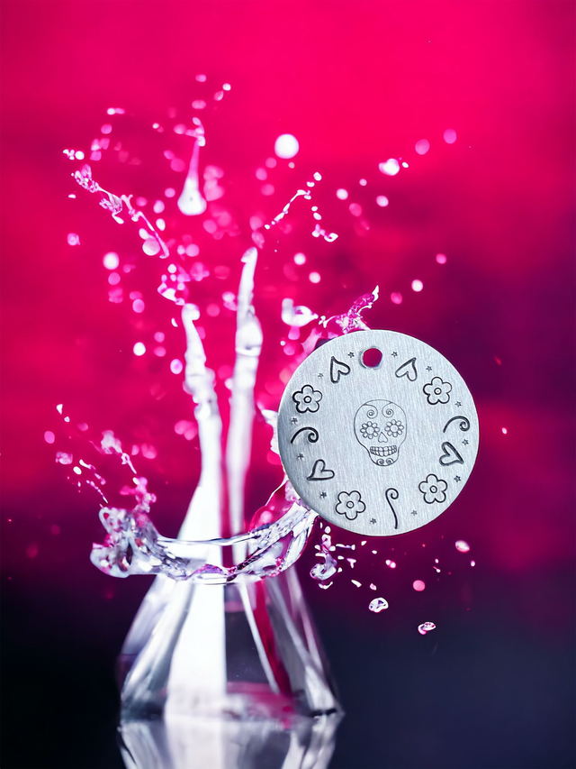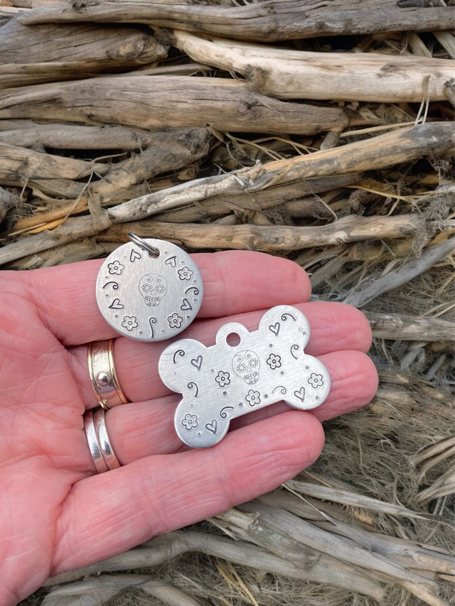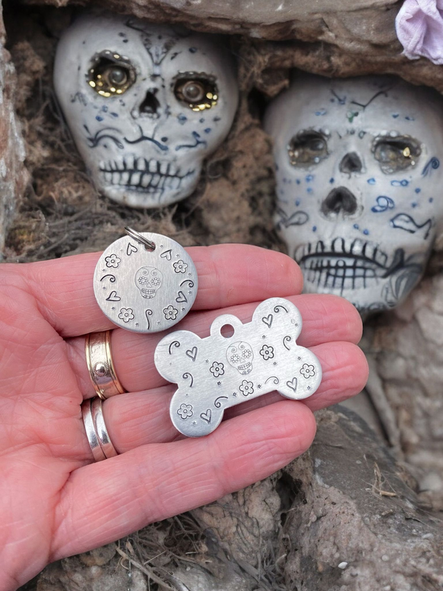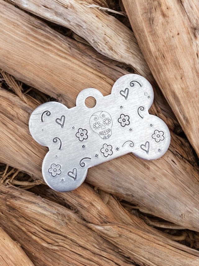 Sugar Skull themed handstamped personalised pet tag